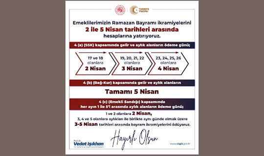 Bakan Işıkhan sosyal medya hesabından yaptığı paylaşımda; "Emekli vatandaşlarımızın bayram ikramiyesi ödemeleri Ramazan Bayramı öncesinde 2 Nisan ile 5 Nisan tarihleri arasında banka hesaplarına yatırılacaktır. Kıymetli emeklilerimiz ve aileleri için hayırlı, bereketli olmasını diliyorum." ifadesini kullandı.