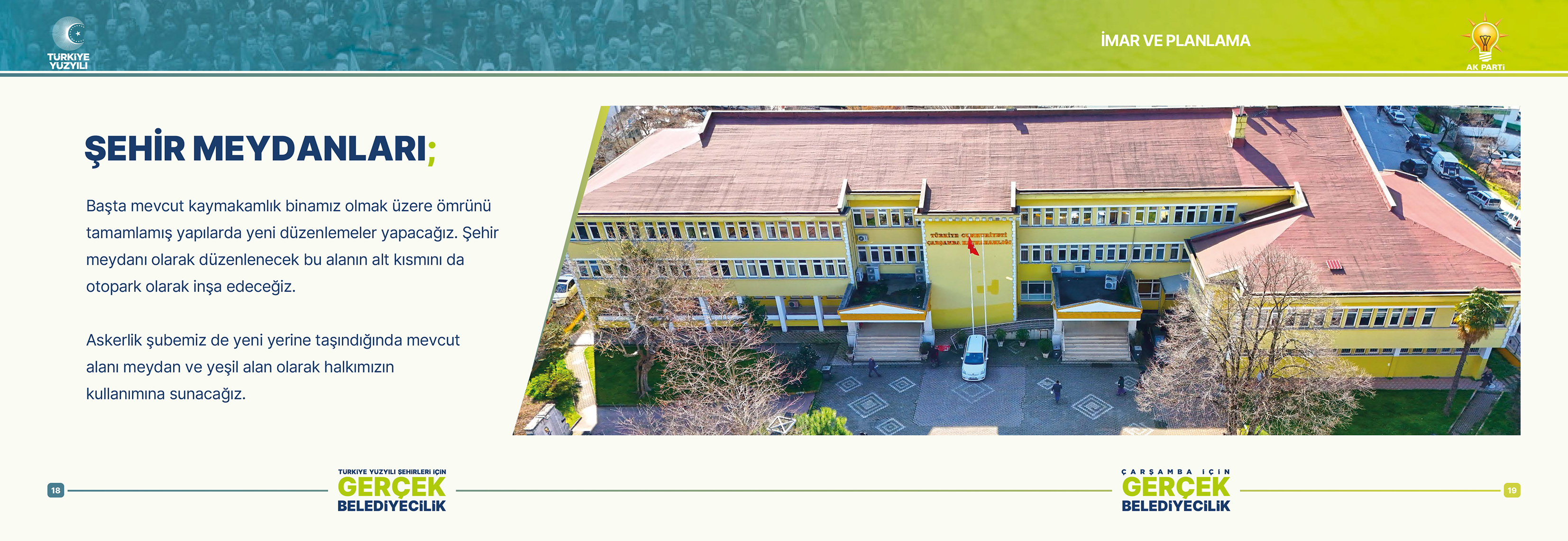 Projelerini bir bir açıklayan Cumhur İttifakı AK Parti Çarşamba Belediye Başkan Adayı Ender Gür, ömrünü tamamlamış kamu binalarını yeni yerlerine taşıyarak şehir meydanları oluşturacaklarını belirterek, "Altı otopark üstü meydan olacak eserlerle Çarşamba merkezi nefes alacak. Çok amaçlı Kültür ve Kongre Merkezi ile Yöresel Ürün Pazarı da ilçeye değer katacak" dedi.