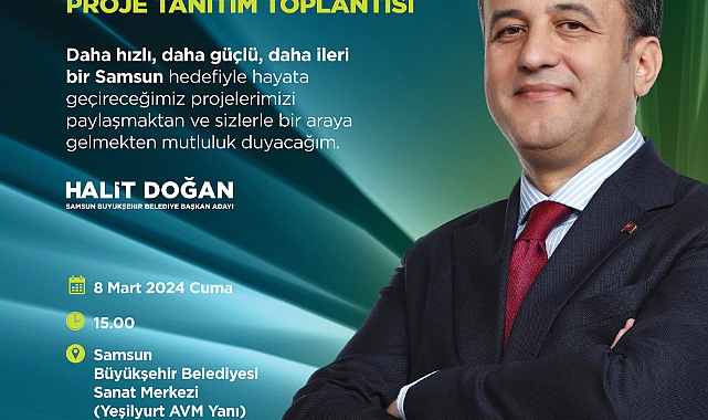 Samsun Büyükşehir Belediyesi Sanat Merkezinde gerçekleştirecek.AK Parti Samsun Büyükşehir Belediye Başkan Adayı Halit Doğan, Samsun için hayata geçireceği projeleri anlatıyor. SBB Başkan Adayı Halit Doğan’ın Proje Lansmanı; 8 Mart Cuma günü saat 15.00’te Atakum’da Samsun Büyükşehir Belediyesi Sanat Merkezinde gerçekleşecek.Tüm vatandaşları Proje Lansmanına davet eden Büyükşehir Adayı Halit Doğan, “Daha hızlı, daha güçlü, daha ileri bir Samsun hedefiyle, Samsun'umuzun fikirlerini dinleyerek oluşturduğumuz projelerimizi paylaşacağımız ‘Proje Tanıtım Toplantımıza’ tüm hemşehrilerimizi bekliyoruz” diye konuştu.Proje Lansmanı 8 Mart’taDaha hızlı, daha güçlü, daha ileri Samsun için projeleri açıklayacak olan Cumhur İttifakı AK Parti Samsun Büyükşehir Belediye Başkan Adayı Halit Doğan, “Samsun’umuzu daha ileri taşımak için yola çıktık. Ulaşımdan turizme, tarımdan sosyal belediyeciliğe, dirençli şehirlere her alanda projelerimizi hazırladık. Samsun’a fikrinle yön ver diyerek, projelerimizi Samsun’a sorarak hayata geçiriyoruz. Akademik kadrolarımıza, gençlerimize, yaşlılarımıza, sivil toplum kuruluşlarımıza, şehrimizin tüm dinamiklerine kulak verdik. İstişarelerimizi yaparak, saha araştırmalarımızı gerçekleştirerek, bilim insanlarımız ve konunun uzmanlarıyla projelerimizi tek tek değerlendirerek projelerimizi oluşturduk. Daha hızlı, daha güçlü, daha ileri Samsun diyerek çıktığımız bu yolda; Samsun’u Türkiye Yüzyılı’nın parlayan yıldızı haline getireceğiz. 17 ilçemizin tamamında bir ahenk içerisinde hareket ederek Samsun’umuzu hak ettiği değere kavuşturacağız. Samsun’umuz; sanayisi, tarımı, turizmi, tarihi ve kültürel değerleri, doğal güzellikleri ve üniversitesi ile Karadeniz Bölgesi’nin incisi bir şehir. Biz bu değerin ve potansiyelin bilincindeyiz. Projelerimizi de bu doğrultuda hayata geçiriyoruz. Samsun'umuzun fikirlerini dinleyerek oluşturduğumuz projelerimizi paylaşacağımız ‘Proje Tanıtım Toplantımızı’ 8 Mart Cuma günü saat 15.00’te Atakum’da Samsun Büyükşehir Belediyesi Sanat Merkezinde gerçekleştireceğiz. Tüm hemşehrilerimizi Proje Lansmanımıza bekliyoruz” diye konuştu.